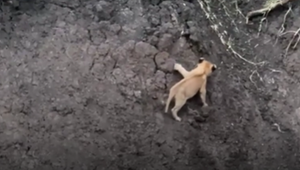 Kleine Raubkatze hat am steilen Flussufer zu kämpfen